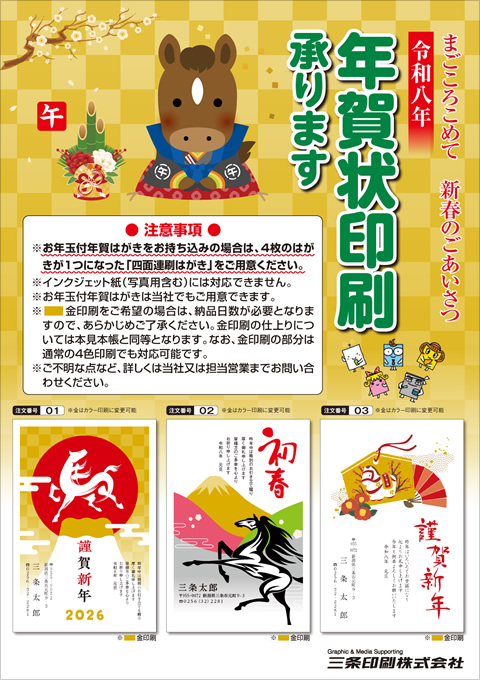 NEWS & TOPICS 現在の位置: ホーム NEWS & TOPICS 一覧 お知らせ 一覧 令和8年(2026年) 年賀状印刷の受付を始めました。 令和8年(2026年) 年賀状印刷の受付を始めました。 お知らせ 2025年10月21日New! 年賀状を書く季節が近づいて参りました。三条印刷株式会社ではビジネスからパーソナルまで使っていただけるデザインをご用意しております。 サンプルはこちらをクリックしてください。 詳しくは下記までご連絡ください。 TEL(0256)32-2281(代)FAX(0256)32-2670